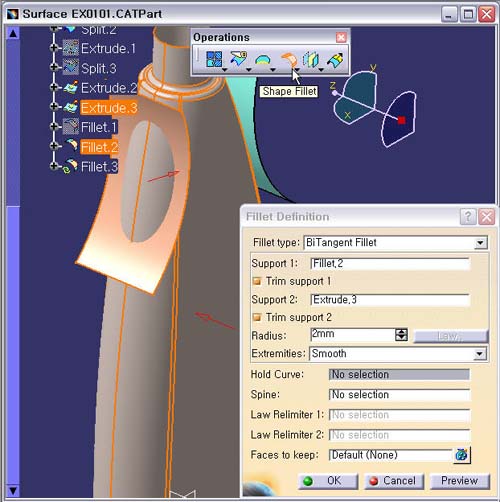1. Shape Fillet.3 ÀÛ¾÷Çϱâ Shape Fillet ¾ÆÀÌÄÜÀ» ¼±ÅÃÇÑ´Ù. Fillet type : BiTangent Fillet Support 1 : Fillet.2 Support 2 : Extrude.3 Radius : 2mm Preview ¹öưÀ» È®ÀÎ ÈÄ, OK ¹öưÀ» Ŭ¸¯ÇÑ´Ù.