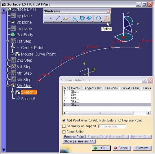 1. Spline ¾ÆÀÌÄÜÀ» ¼±ÅÃÇÑ´Ù. Sketch.8¿¡¼ ´ÙÀ½ÀÇ Point.1ºÎÅÍ Point.5 ±îÁö ¼ø¼´ë·Î ¼±Åà À» ÇÑ´Ù.