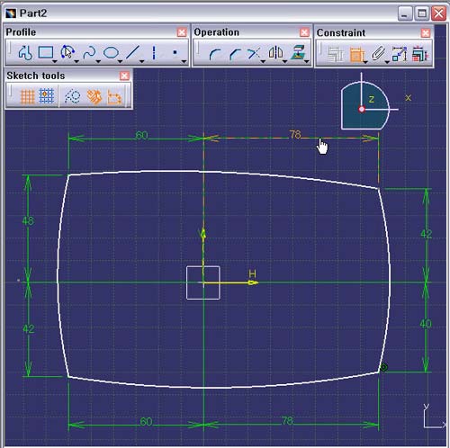 2. Constraint Tools Tool BarÀÇ Constraint ¾ÆÀÌÄÜÀ» ¼±ÅÃÇÑ´Ù. °¢°¢ÀÇ Arc ³¡ Point¿Í H Axis ¹× V Axis ¿ÍÀÇ °Å¸® Ä¡¼ö¸¦ ÀÔ·ÂÇÑ´Ù.