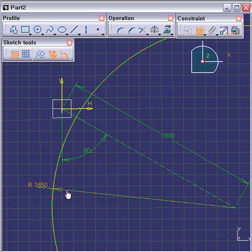 3. Constraint Tools Tool BarÀÇ Constraint ¾ÆÀÌÄÜÀ» ÀÌ¿ëÇÏ¿© R1650ÀÎ Radius Ä¡¼ö¸¦ ÀÔ·ÂÇÑ´Ù.