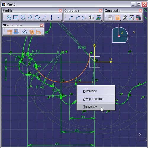2. R34 ¿ø°ú »ý¼º Á÷¼±À» ¼±Åà ÈÄ, ¸¶¿ì½º ¿À¸¥ÂÊ ¹öưÀÇ Contextual Menu¸¦ È®ÀÎÇÑ´Ù. Tangency¸¦ ¼±ÅÃÇÑ´Ù.